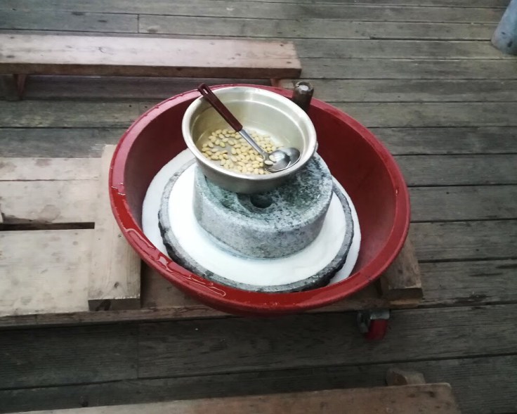 L’antico processo di produzione prevedeva che le fave di soia venissero lasciate in acqua per circa 48 ore e successivamente spremute attraverso l’uso di queste “presse”.