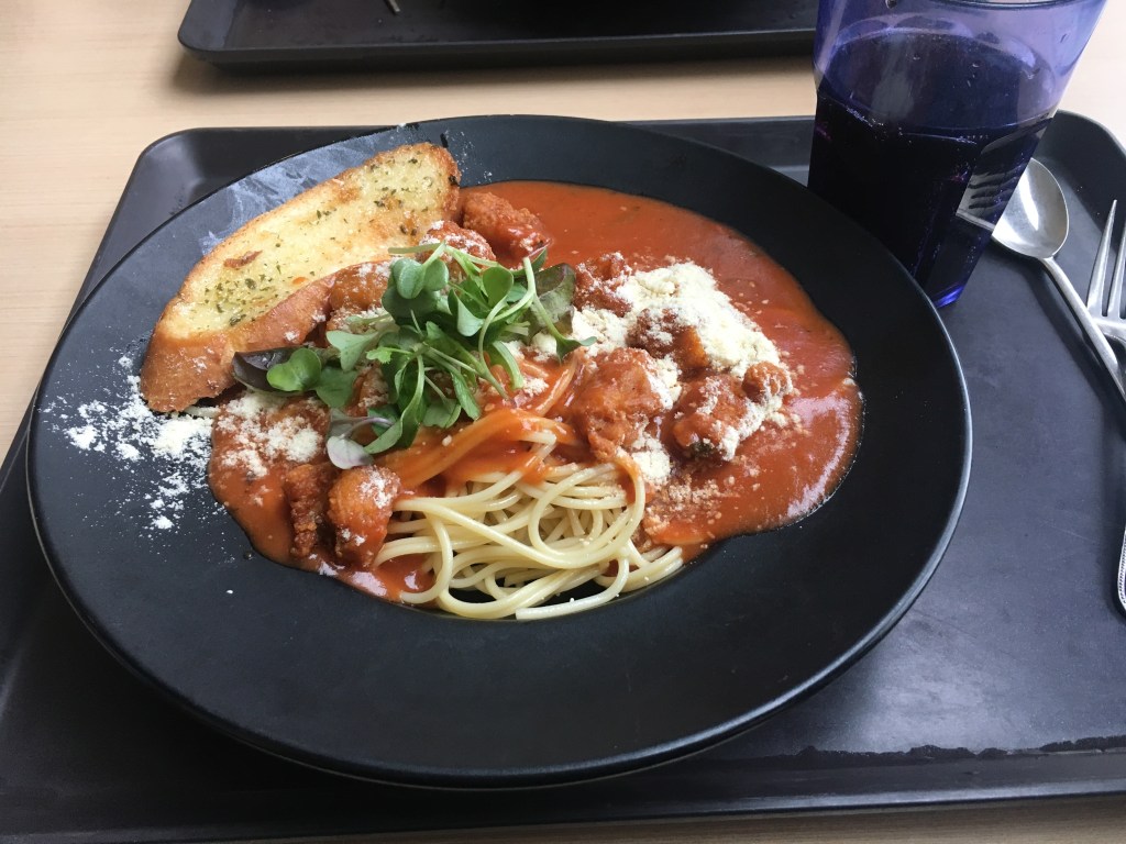 Tutto bellissimo se non fosse che il sugo è dolce quasi quanto una torta e l’insalata dovrebbe ricordare il basilico (?).